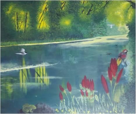 Ce paysage exotique et mystérieux représente-il un hymne à la beauté et la diversité de la nature, à la paix et la sérénité ? La présence d’animaux sauvages est-elle un rappel de l'importance de protéger la biodiversité et une dénonciation du peu d’effort de sa protection?