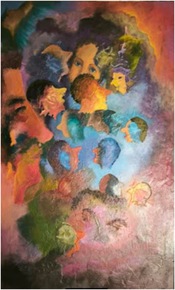 Comme un flux de mémoire, des visages surgissent et se dissipent, comme des échos d’histoires entremêlées. Certains nets, d’autres effacés, ils figurent une mémoire mouvante, une identité morcelée par le temps et l’expérience, des présences fragmentées, oscillant entre apparition et disparition, entre réalité et réminiscence. Les couleurs, en tension entre tons chauds et froids racontent un dialogue entre le tangible et l’évanescent, la lumière et l’ombre. Un regard, au centre, plus net et plus affirmé, parait être un point d’ancrage et un témoin au milieu de ce flux d’existences. Est-il une conscience qui veille, guide ou interroge ? Ou bien une projection du spectateur lui-même, l’invitant à plonger dans ce kaléidoscope de visages et d’émotions ?