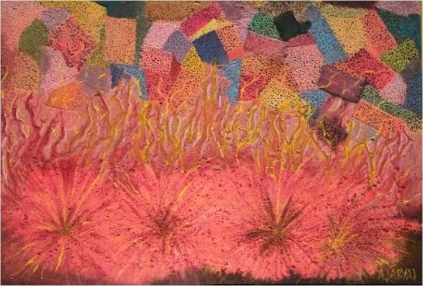 Y’a-t-il une suggestion de fleurs de feu, de coraux flamboyants ou encore de phénomènes volcaniques, en tous cas d’une force vitale en pleine expansion ? Le contraste entre l’organique et le construit évoque-t-il un passage, une transformation, où le chaos incandescent se métamorphose en un monde plus ordonné ? La tension entre l’instinct et la construction, le spontané et le réfléchi, ou encore entre nature et civilisation mène-t-elle nécessairement à ce monde plus ordonné ?