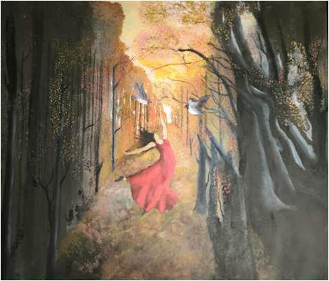 Que penser de cette femme en rouge qui semble en communion avec la forêt ? Son mouvement fluide, les oiseaux en vol et la lumière qui s’élève dans le ciel peuvent-il suggérer une quête ? Est-elle en fuite, en recherche d’une élévation spirituelle, ou simplement en train de renaître à elle-même ?
