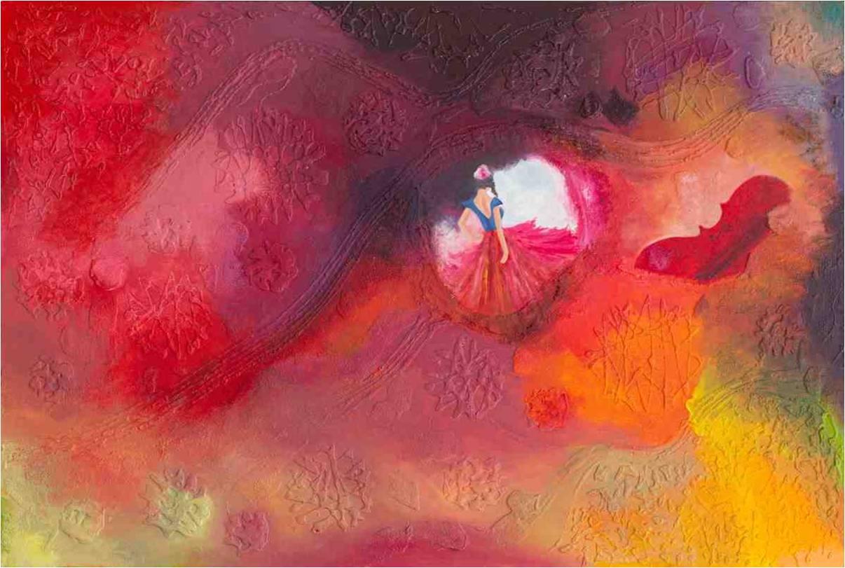 L'interaction entre les teintes et les matières cherche une énergie vibratoire, entre flamenco et abstraction, entre son et lumière. Franchira-t-elle la frontière entre réel et imaginaire ?